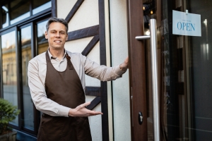 heureux-proprietaire-de-pub-accueillant-un-invite-debout-a-la-porte-d-entree-et-regardant-la-camera